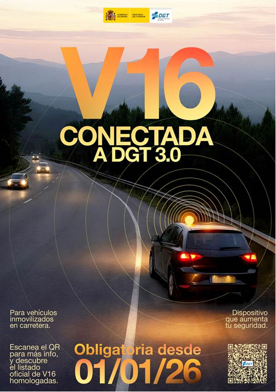 A partir do 1 de xaneiro de 2026, todos os turismos, vehículos mixtos, transporte de mercadorías e autobuses deberán levar unha baliza V16 conectada á plataforma DGT 3.0. Este dispositivo substitúe os triángulos de emerxencia e será o único medio legal para sinalizar un vehículo inmobilizado na estrada.